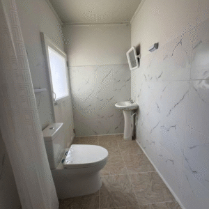 Tường và sàn toilet được ốp gạch men toàn phần, chống ẩm, sạch đẹp, sang trọng – tăng độ bền và trải nghiệm sử dụng.